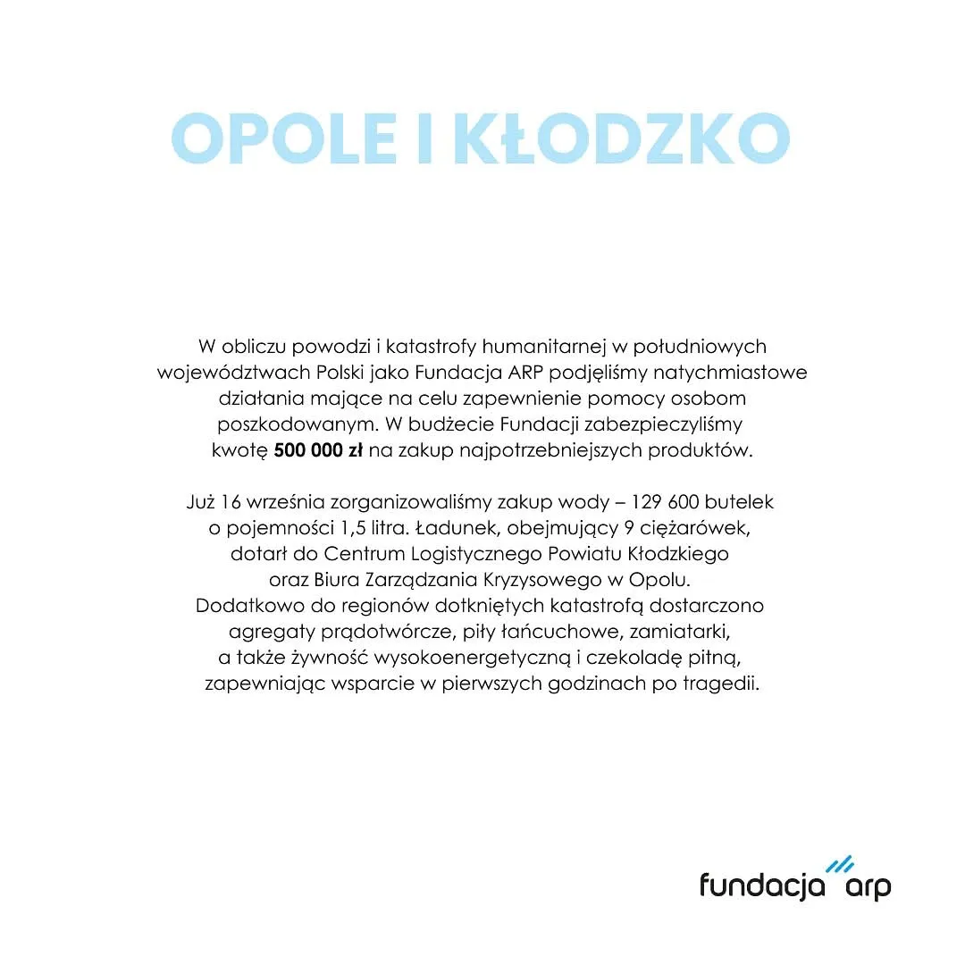 W odpowiedzi na powódź i kryzys w południowych województwach Polski, Agencja Rozwoju Przemysłu zainicjowała szeroko zakrojone działania pomocowe na rzecz osób poszkodowanych. Do realizacji wsparcia włączone zostały spółki z Grupy ARP, a Fundacja ARP wsparła te działania, zabezpieczając środki finansowe oraz uruchamiając mechanizmy pomocowe.